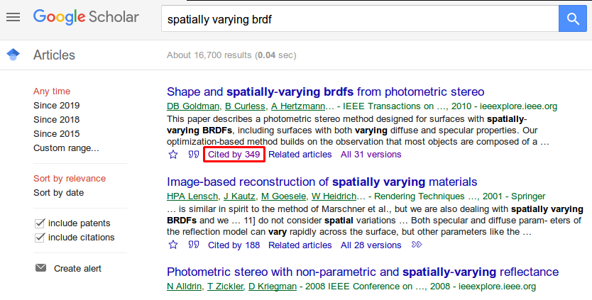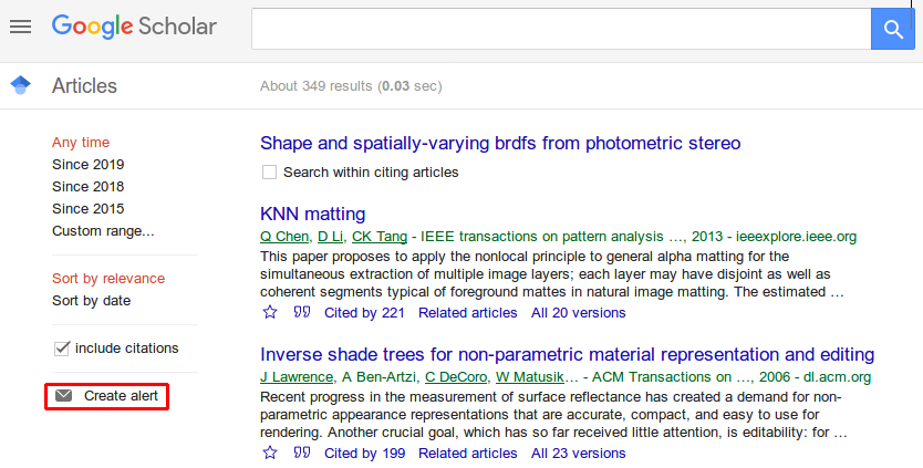 However, especially for newer papers that have not yet been cited, for example the ones coming in through an already existing Scholar alert, there is no way to create an alert. The “Cited by” link is simply not displayed under those papers, and without it, there is no way to directly create an alert for a paper. You can of course enter the paper title as a search term, but that usually gives you a lot of other hits that you might not always want to get notified of.